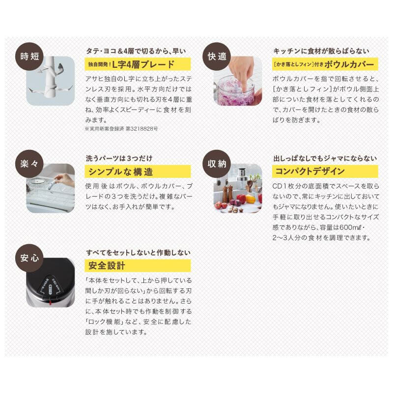 • Features Asahi Light Metal's patented L-shaped stainless steel blade that not only cuts horizontally but also vertically, with four layers stacked for increased efficiency.