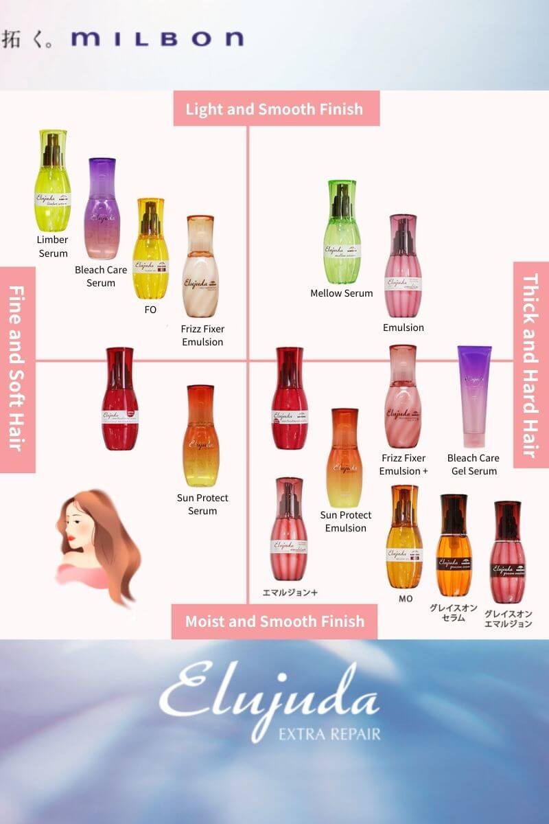 Discover all 14 Milbon Elujuda treatments in one clear guide. Compare textures, hair types, and concerns to find your perfect leave-in treatment.