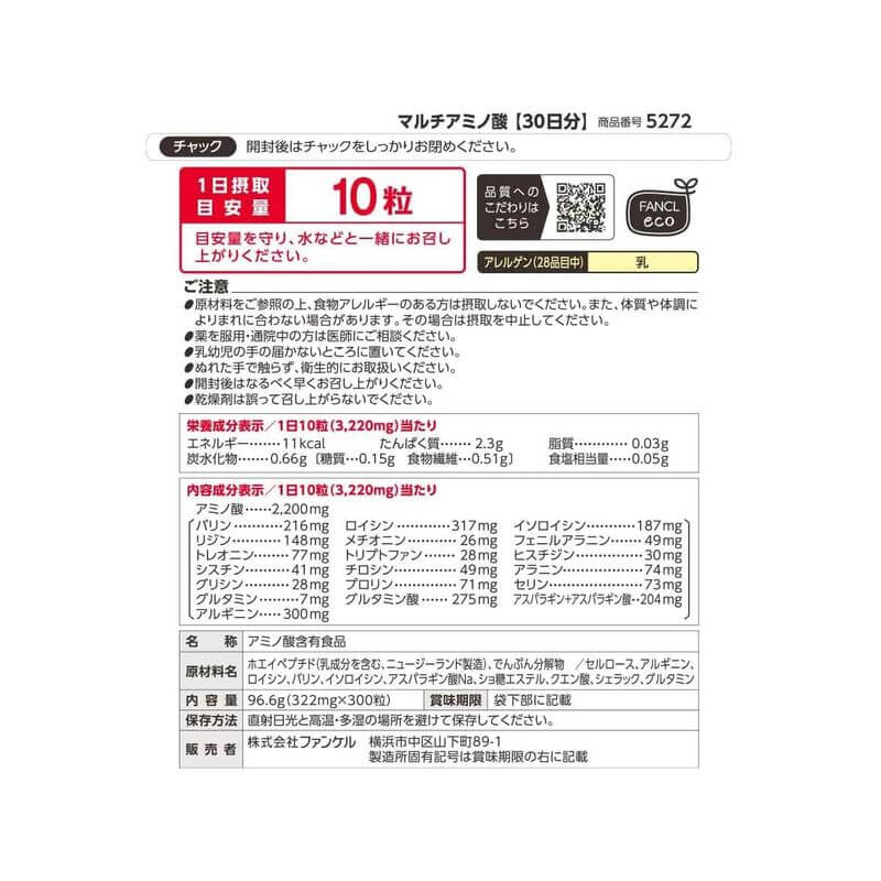 • 主要成分(每10粒):胺基酸 2,200mg[纈胺酸 216mg、白胺酸 317mg、異白胺酸 187mg、離胺酸 148mg、蛋胺酸 26mg、苯丙胺酸 49mg、蘇胺酸 77mg、色胺酸 28mg、組胺酸 30mg、半胱胺酸 41mg、酪胺酸 49mg、精胺酸 300mg、丙胺酸 74mg、天門冬胺酸 200mg、麩胺酸 275mg、甘胺酸 28mg、脯胺酸 71mg、絲胺酸 73mg、麩醯胺酸 7mg、天門冬醯胺酸 4mg]