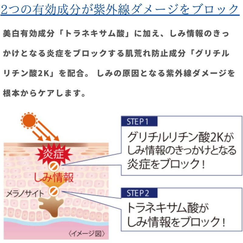 • 含美白有效成分「傳明酸」與抗炎成分「甘草酸二鉀」,抑制黑色素生成並預防斑點、雀斑